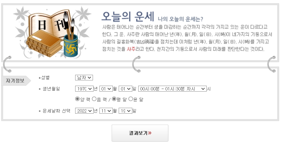 ③ 원하시는 운세를 클릭하신 후 정보를 입력하시면, 바로 결과가 나옵니다.