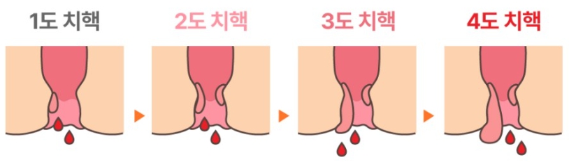④ (4도 치핵) 가장 심한 단계로 배변을 하지 않아도 덩어리가 돌출된 상태입니다. 증상에 대해 더욱 자세한 정보를 원하시면 아래를 통해 무료로 확인하시기 바랍니다.
