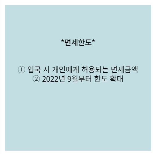 2022년부터 달라진 면세한도를 알려드리겠습니다. 총금액은 600달러에서 800달러로 상향되었으며, 주류(술)는 400달러 이하는 유지하되 기존 1리터(ℓ) 1병에서 2병으로 확대됐습니다. 담배, 향수는 각각 200개비와 60㎖로 기존과 동일합니다.
