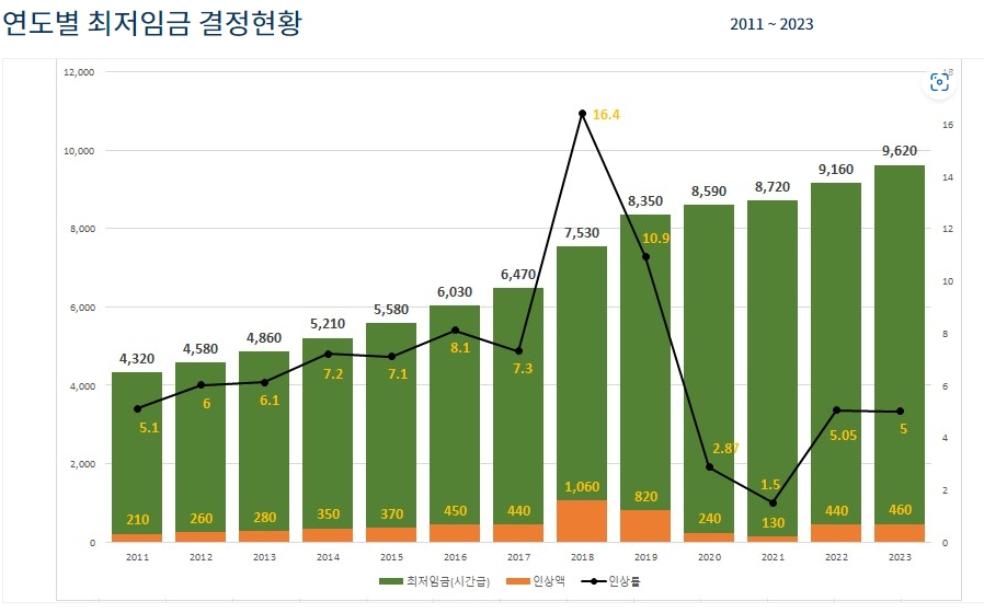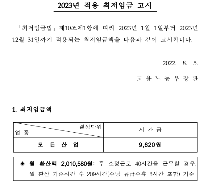 지난 8월 5일 고용노동부 장관이 발표한 2023년 최저임금 확정 금액은 월 209시간 기준 201만 580원입니다. 시급으로는 9,620원입니다. 2022년 197만 4,440원(시급 9,160원) 대비 5% 상승한 금액이며, '2022년 소비자물가상승률(4.5%)+경제성장률(2.7%)-취업자 증가율(2.2%)' 공식을 반영해 결정되었습니다. 이 공식에는 물가상승 및 경제성장으로 인한 외부요인은 노동자의 최저임금을 인상해야 하는 요인이고, 취업자 증가는 일을 할 사람이 많아진다는 것을 뜻하기 때문이 최저임금의 인하 요소가 된다는 원칙이 담겨 있습니다.