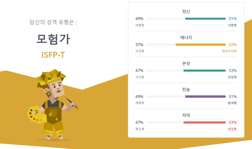 이곳에서는 무료로 mbti 성격유형검사가 가능하며, 설문을 마친 후 결과지를 바로 받을 수 있습니다.
