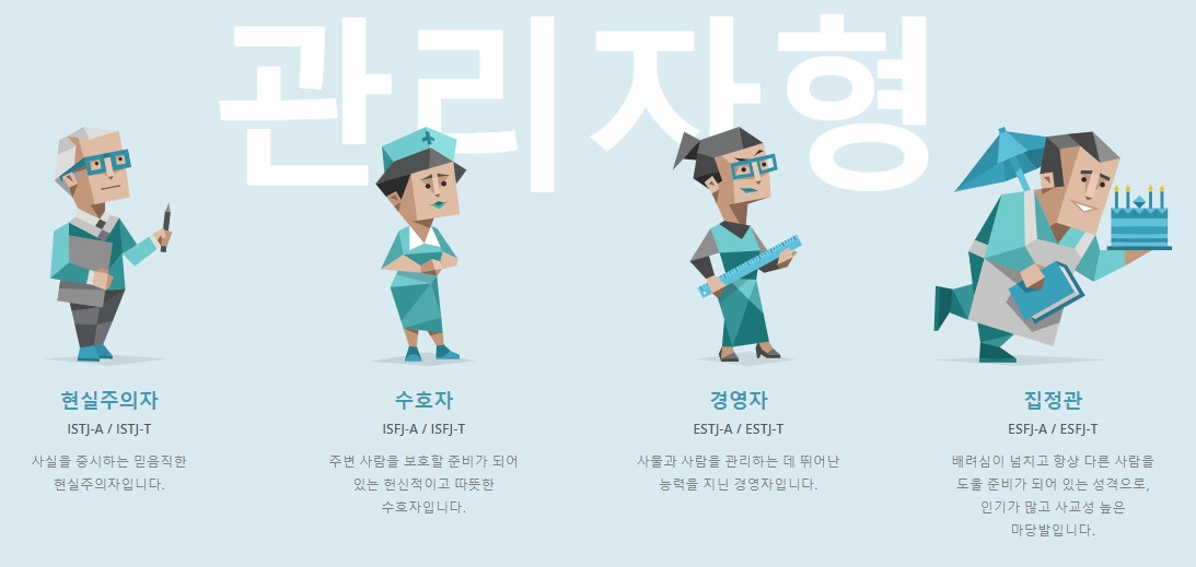 다. (관리자형) ① 현실주의자 ISTJ / ② 수호자 ISFJ ③ 경영자 ESTJ ④ 집정관 ESFJ
