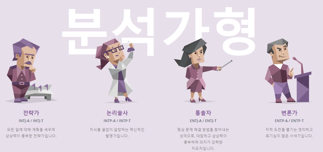 가. (분석가형) ① 전략가 INTJ / ② 논리술사 INTP / ③ 통솔자 ENTJ / ④ 변론가 ENTP