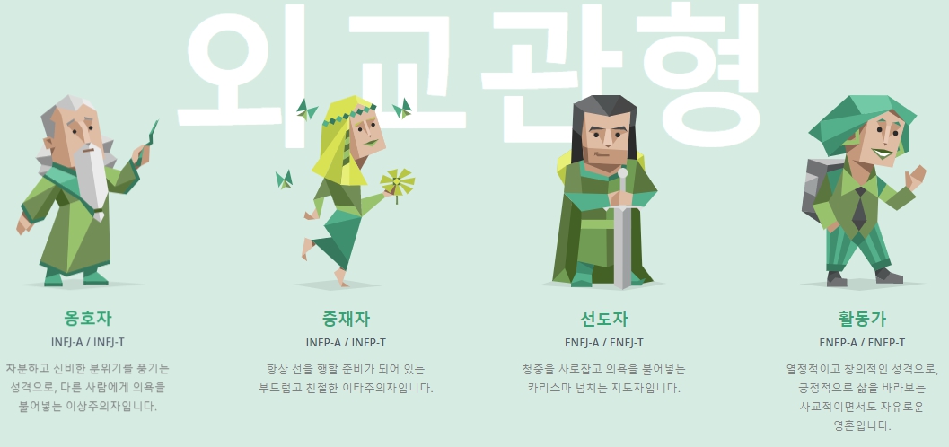 나. (외교관형) ① 옹호자 INFJ / ② 중재자 INFP ③ 선도자 ENFJ ④ 활동가 ENFP